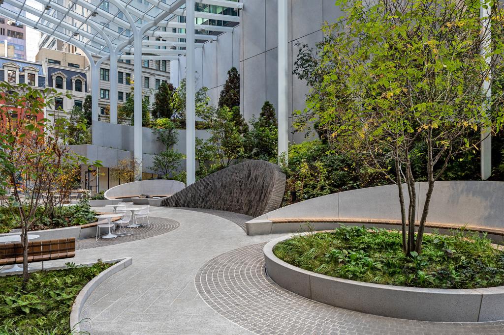The open-air, half-acre urban garden designed by Snohetta sits beneath a 70-foot-high glass canopy. As if taking cues from the High Line or Little Island, it boasts 48 trees, 200 shrubs, 6,300 bulb plants, “10,000 herbaceous understory plants,” plus three food kiosks and lots of seats. Sinuous curves and varied elevations soften the arcade’s rectilinear proportions.