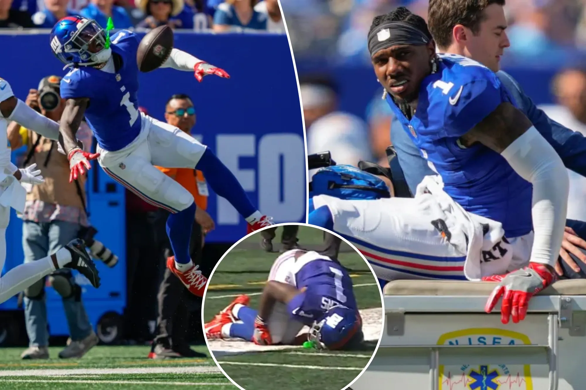 The sight of the cart coming onto the field brought a collective groan from the crowd at MetLife Stadium. Nabers was cheered in support by those fans — and raised his hand to acknowledge the love — as the cart disappeared down the tunnel with a towel covering his face.