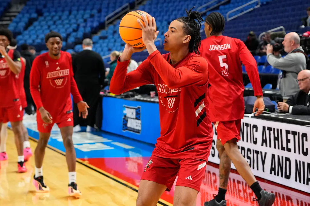 Louisville Cardinals Guard Mikel Brown Jr. (0) shoots the ball during a practice session ahead of the first round of the men's 2026 NCAA Tournament.
