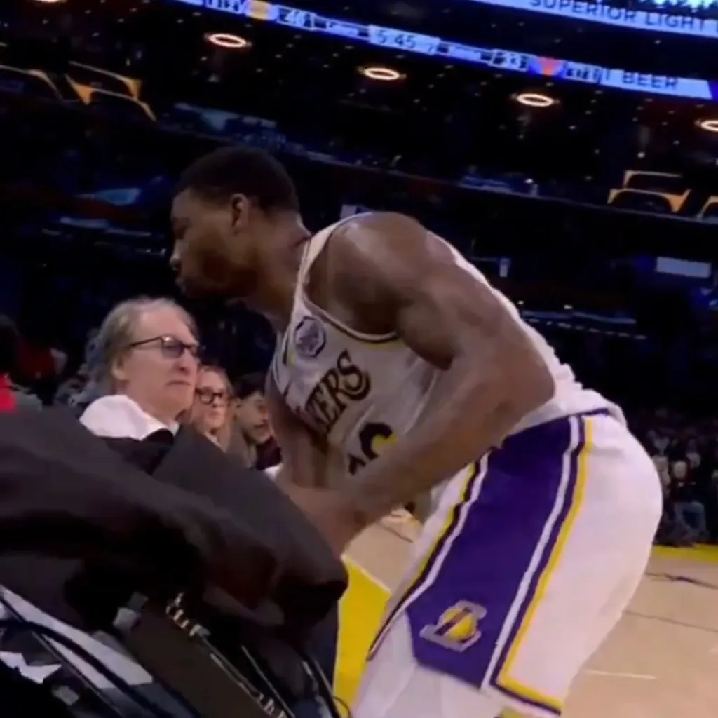 Marcus Smart goes crashing into Bill Maher during the Lakers’ win over the Knicks. @NBA_NewYork/X