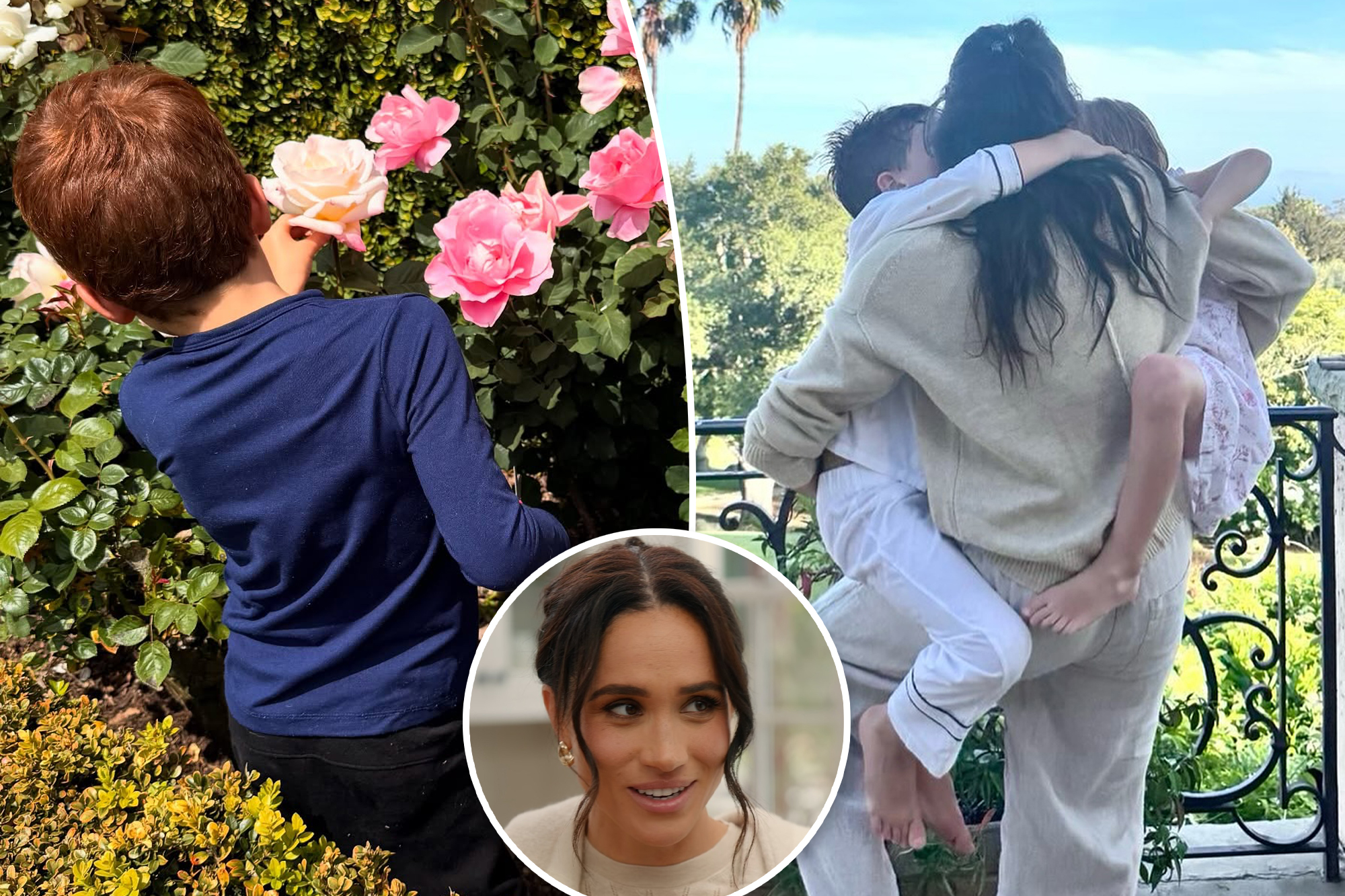 Neither Markle nor her kids’ faces appear in the snap, taken on what appears to be their Montecito, Calif., balcony. All of their backs are to the camera as she holds Archie and Lilibet in each arm, and they climb all over her.