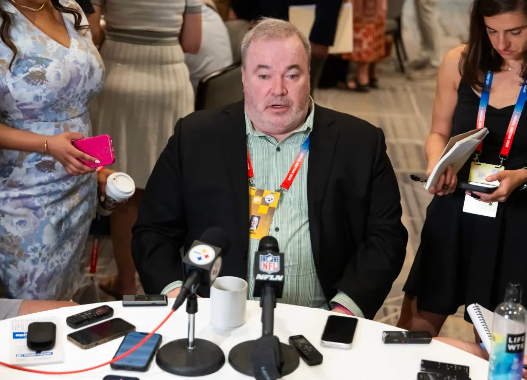 Pittsburgh Steelers head coach Mike McCarthy speaks to reporters in the media during the 2026 NFL Annual League Meeting at the Arizona Biltmore in Phoenix on March 31, 2026.