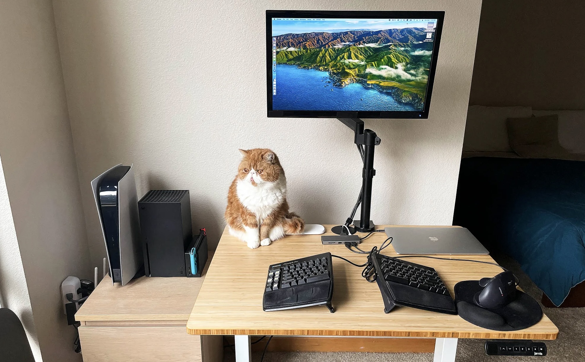 Cat sitting on desk next to monitor, keyboard, and other devices.