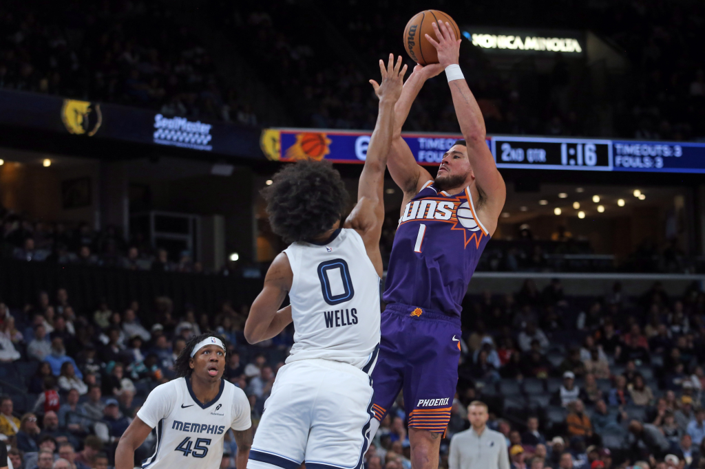 Phoenix Suns guard Devin Booker (1) shoots as Memphis Grizzlies forward Jaylen Wells (0) defends him.