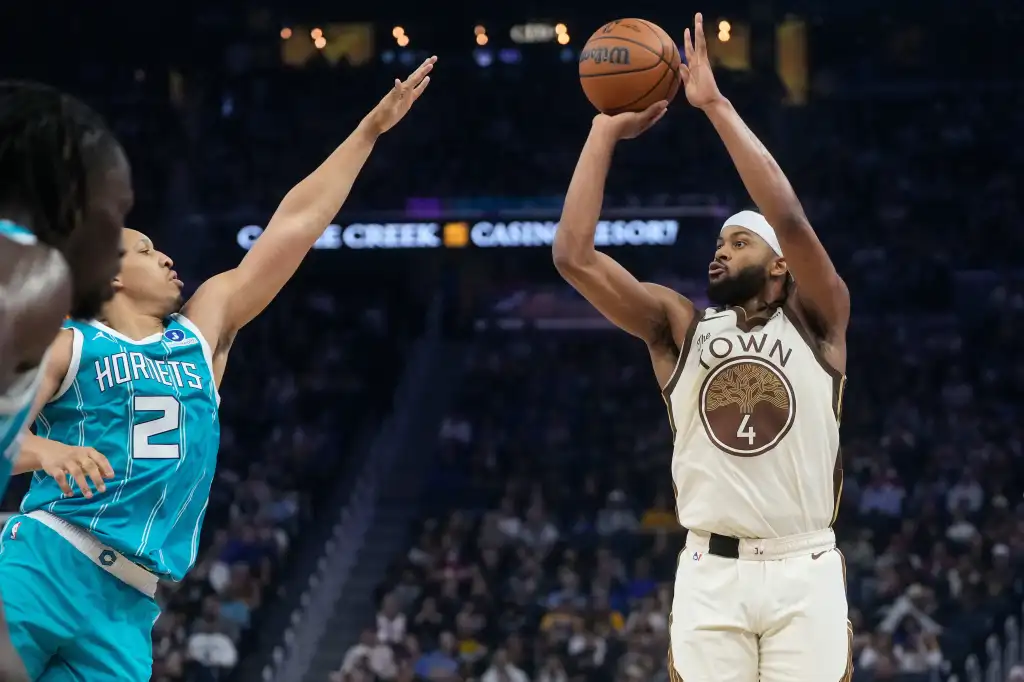 Golden State Warriors guard Moses Moody (4) shoots a 3-point basket against Charlotte Hornets forward Grant Williams (2) during the first half of an NBA basketball game in San Francisco, Saturday, Jan. 17, 2026. AP