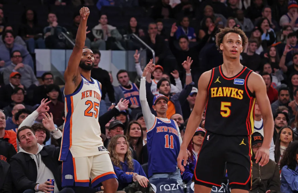 New York Knicks guard Mikal Bridges (#25) watches his jump shot behind Atlanta Hawks guard Dyson Daniels (#5).
