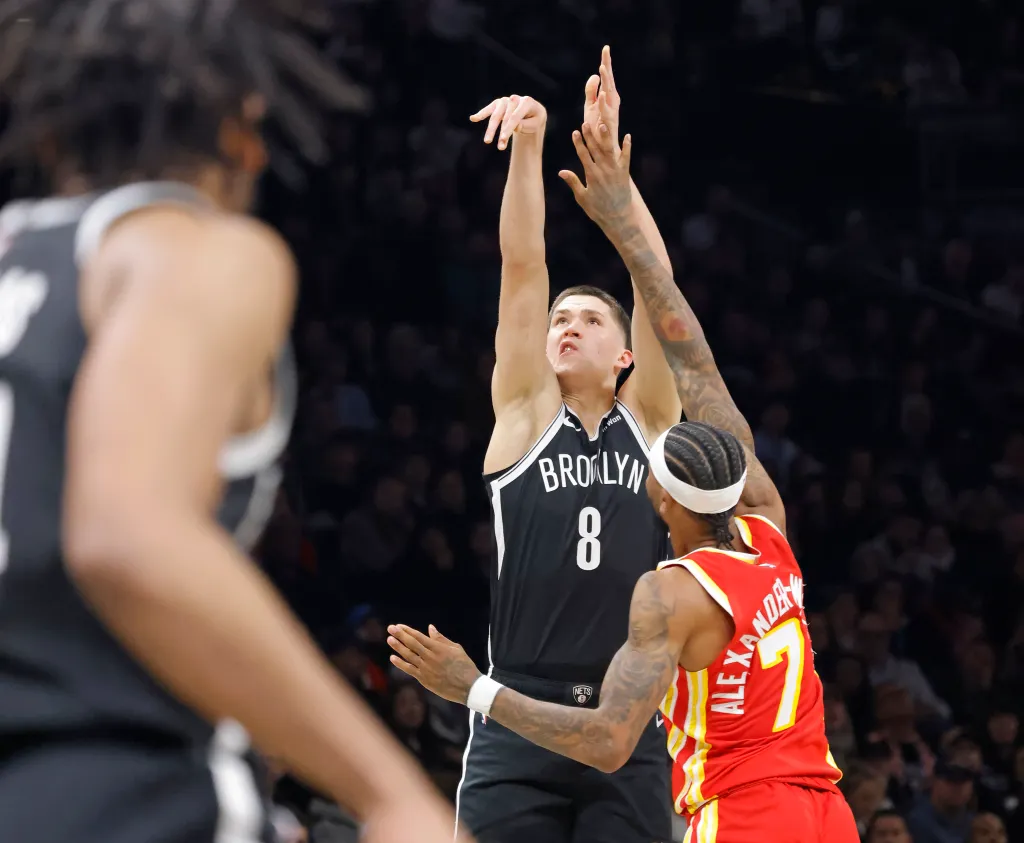 Egor Demin #8 of the Brooklyn Nets puts up a shot over Nickeil Alexander-Walker #7 of the Atlanta Hawks during the first half when the Brooklyn Nets played the Atlanta Hawks Wednesday, October 29, 2025 at Barclays Center in Brooklyn, NY.