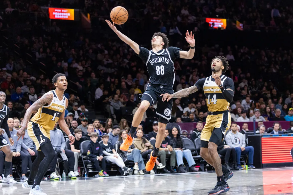 Nets guard Nolan Traore (88) shoots past Washington Wizards Leaky Black during the first half at Barclays Center, Sunday, April 5, 2026, in Brooklyn, NY. Corey Sipkin for the NY POST