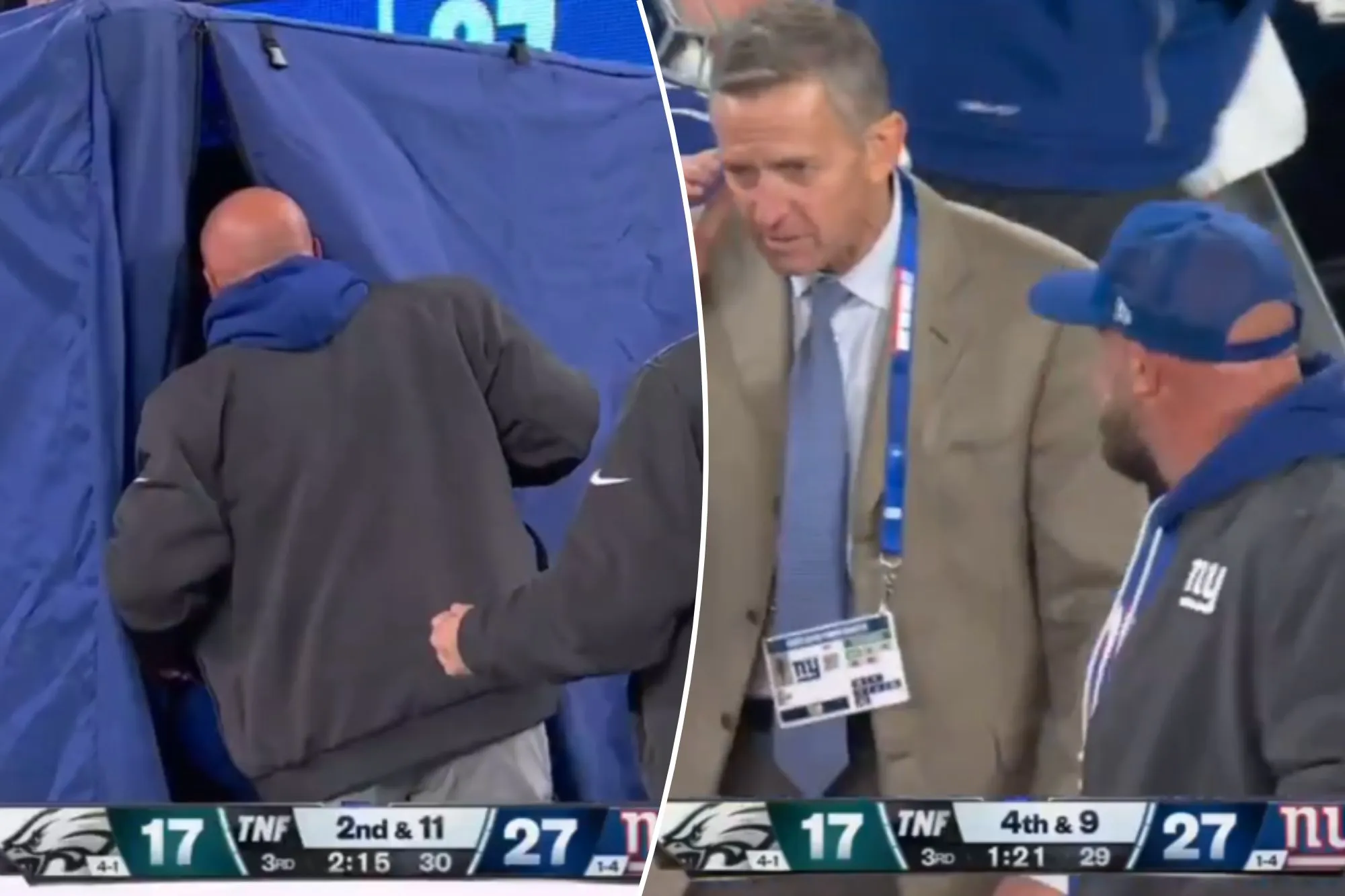 Brian Daboll peers into the blue medical tent during the Giants’ win over the Eagles on Oct. 9, 2025. Amazon Prime