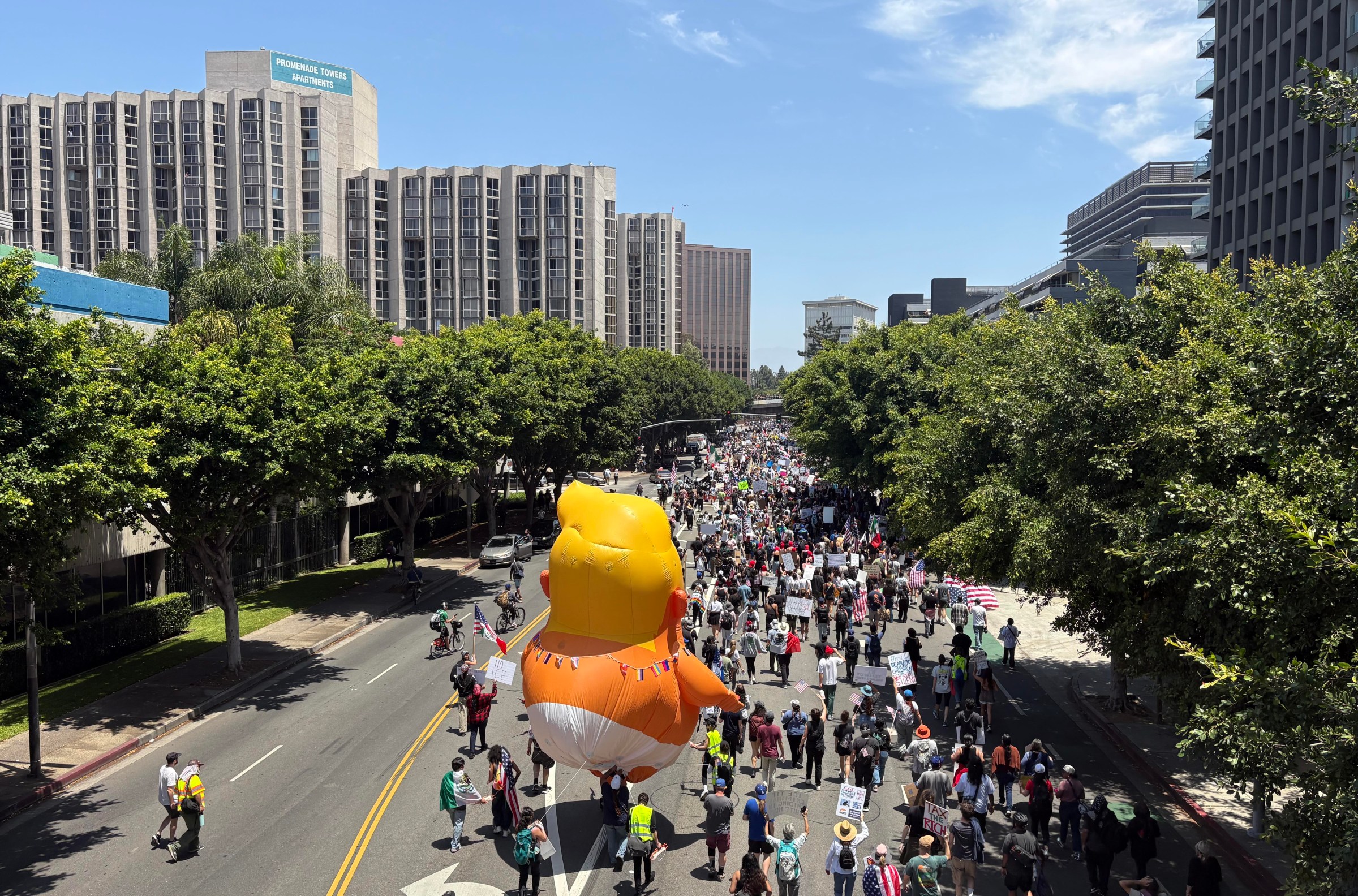 An inflatable baby Donald Trump, dressed in a diaper, hovered over throngs of people rallying outside of Los Angeles City Hall. Demonstrators outnumbered clumps of California National Guard members in fatigues posted up along sidewalks.
