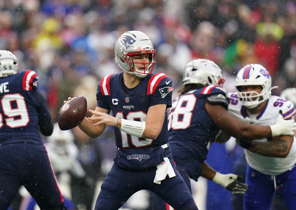 New England Patriots quarterback Drake Maye (10) passes the ball against the Buffalo Bills.