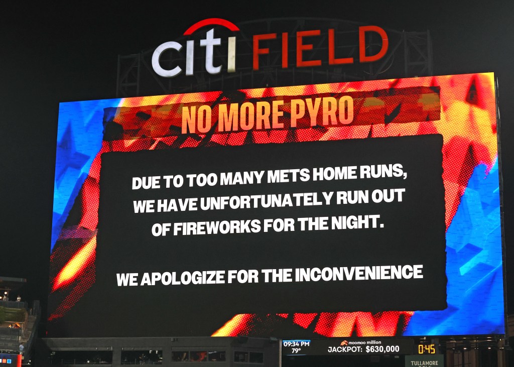 “Due to too many Mets home runs, we have unfortunately run out of fireworks for the night. We apologize for the inconvenience,” the full message read.
