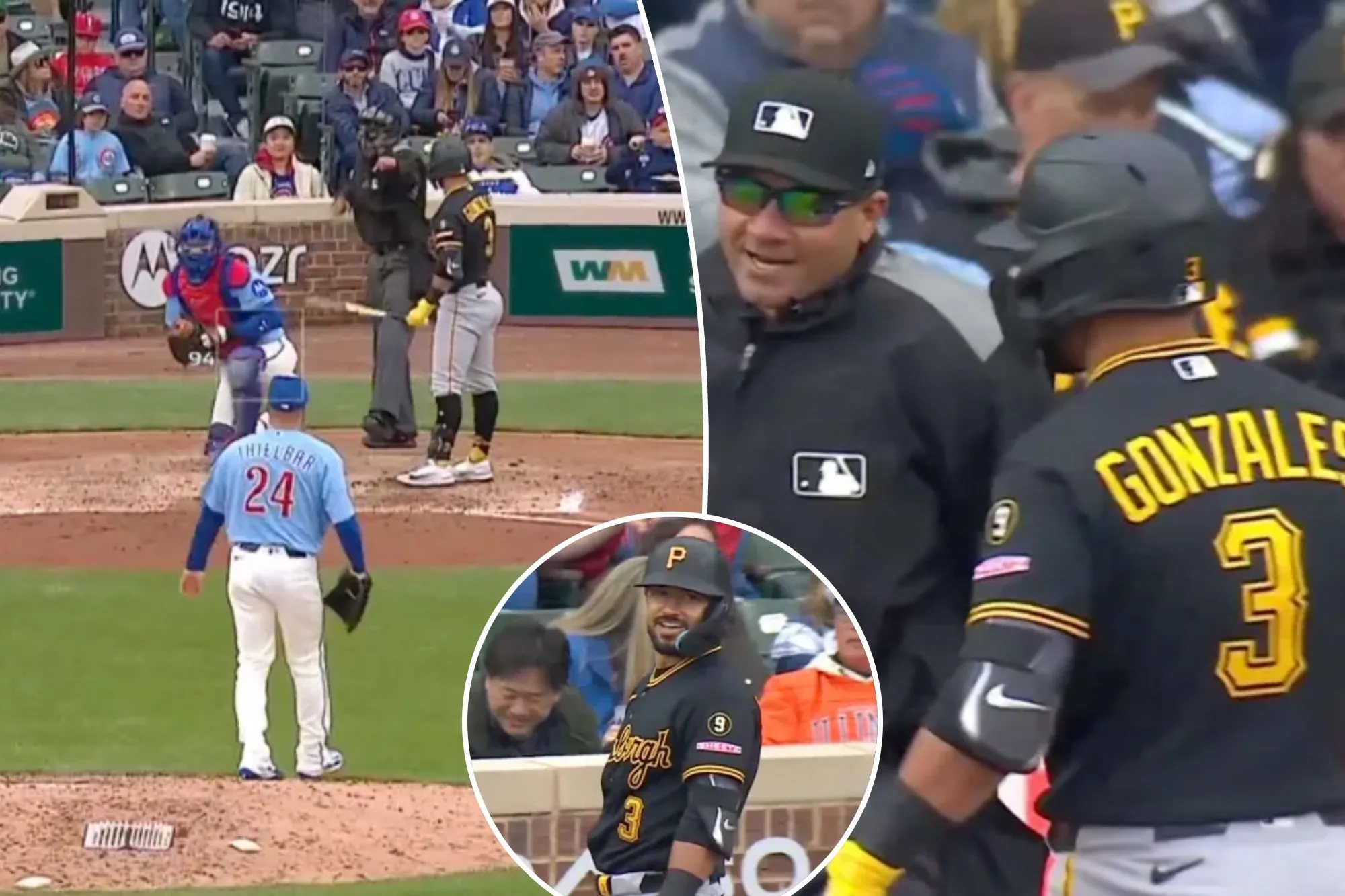 On an 0-2 pitch with one out in the top of the seventh inning during the Pirates’ 2-0 win over the Cubs, Pittsburgh infielder Nick Gonzales took a 94 mph fastball from Chicago left-handed reliever Caleb Thielbar that appeared to be off the plate.