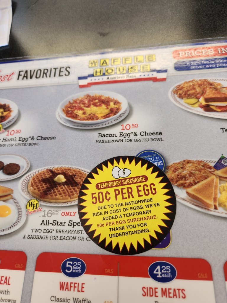 Waffle House announced Monday that a 50-cent surcharge will be implemented per egg due to the bird flu.
