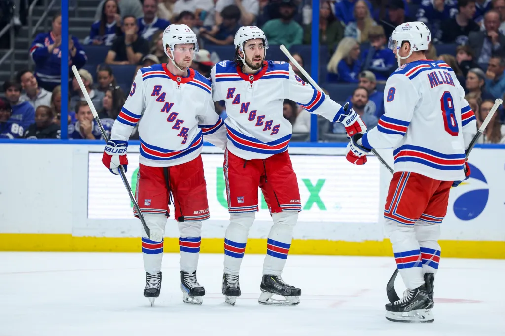 Mika Zibanejad (center) celebrates with Alexis Lafrenière (left) and J.T. Miller after scoring a second-period goal during the Rangers' 4-2 win over the Lightning on April 15, 2026 at Benchmark International Arena.