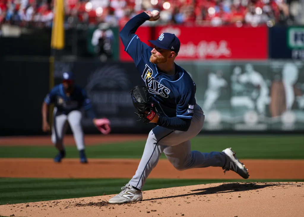 Drew Rasmussen (one run, four hits, two Ks, five innings) throws for the Rays.