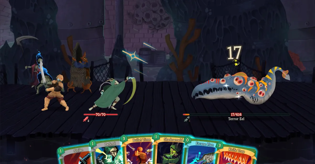 My multiplayer partner was my wife, the biggest Slay the Spire fan I know, and on our second run we got a thrilling victory. I played the new Necrobinder character, a necromancer, while she played as the returning Silent, which can make decks built around flurries of shivs. Over the course of the run, we accidentally settled into a strategy where I focused on applying the Vulnerable status to as many enemies as possible before my wife would rain down shivs upon our foes.