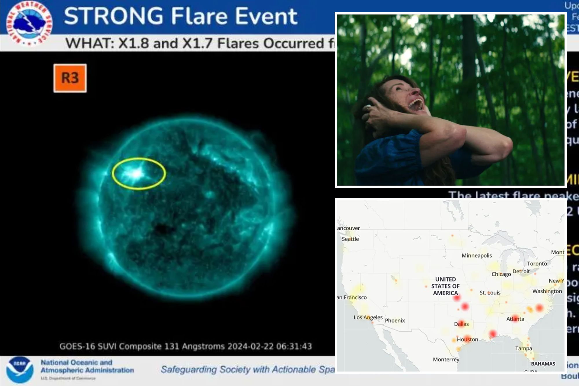 The National Oceanic and Atmospheric Administration’s (NOAA) warned the “strong flare event” could include “temporary degradation or complete loss of [high frequency radio] signal on much of the sunlit side of the Earth.”