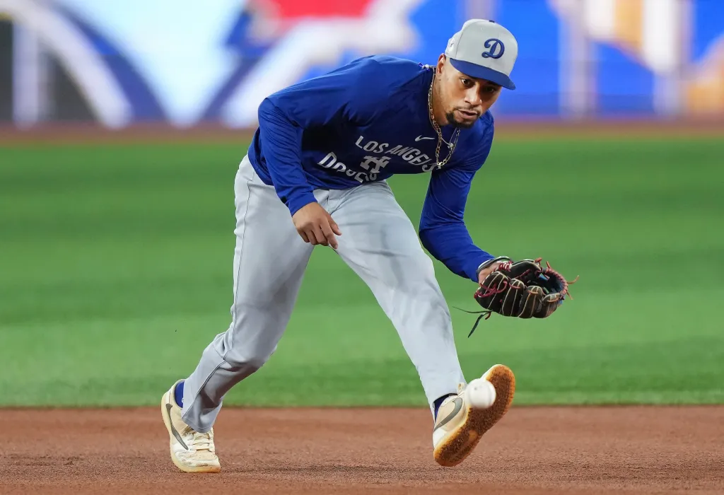 Mookie Betts fields a ground ball during Dodgers practice on Oct. 30, 2025 in preparation for Fridays Game 6 of the World Series against the Blue Jays.