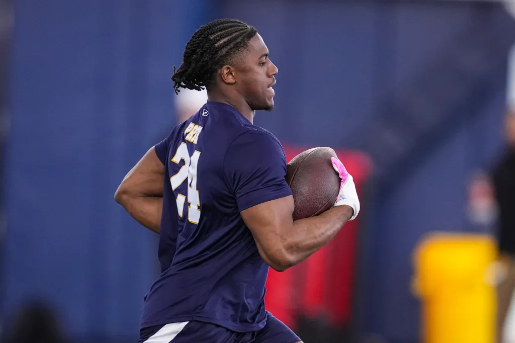 Notre Dame running back Jadarian Price runs a drill during the school’s NFL football pro day in South Bend, Ind., Tuesday, March 24, 2026. AP