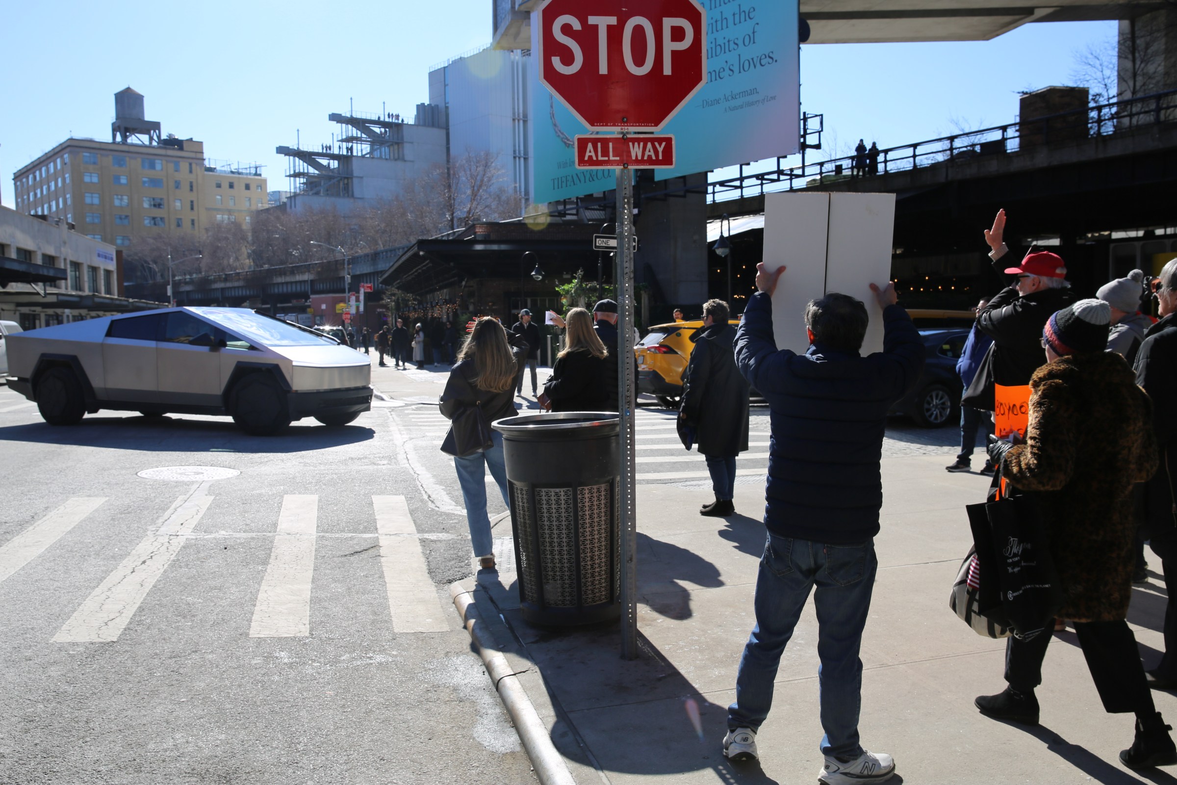 On a recent Saturday afternoon, around 50 sign-wielding protesters stood outside the Tesla showroom in Manhattan’s Meatpacking neighborhood, screaming insults at passing Tesla vehicles.