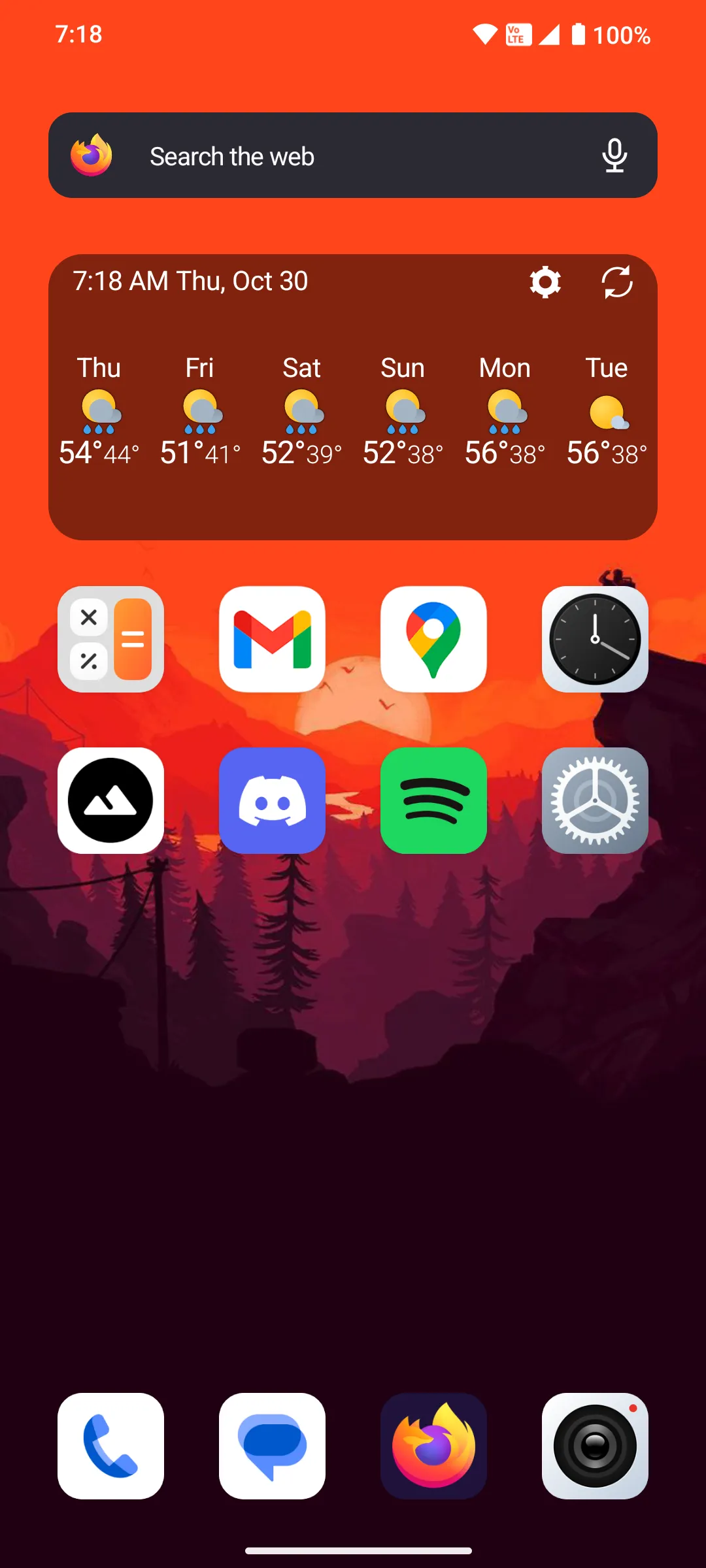 The wallpaper: Some art from Firewatch. I’ve got the orange backplate on my phone so I like to use orange wallpapers to match.