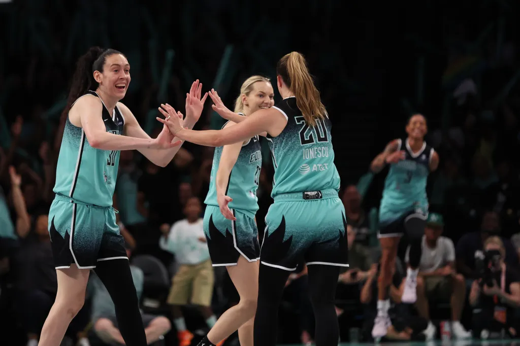 New York Liberty players Breanna Stewart and Sabrina Ionescu high-five during a game against the Phoenix Mercury on July 25, 2025. Heather Khalifa for the NY Post