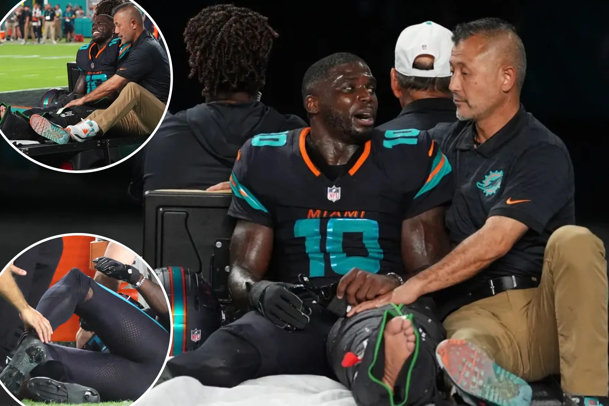 Hill suffered the injury early in the third quarter while catching a sideline pass, with his left leg getting caught underneath while being tackled by Jets safety Malachi Moore with Miami leading, 10-3.