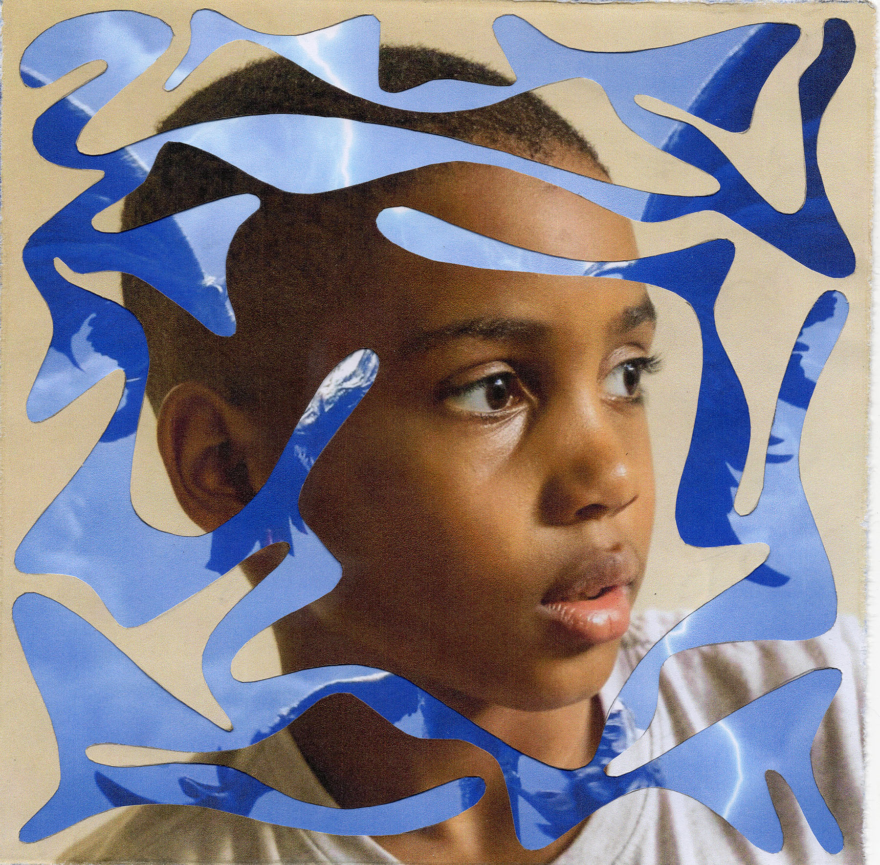 Hand cut photo collage of a young boy’s face overlayed with art from the game Final Fantasy XIV.