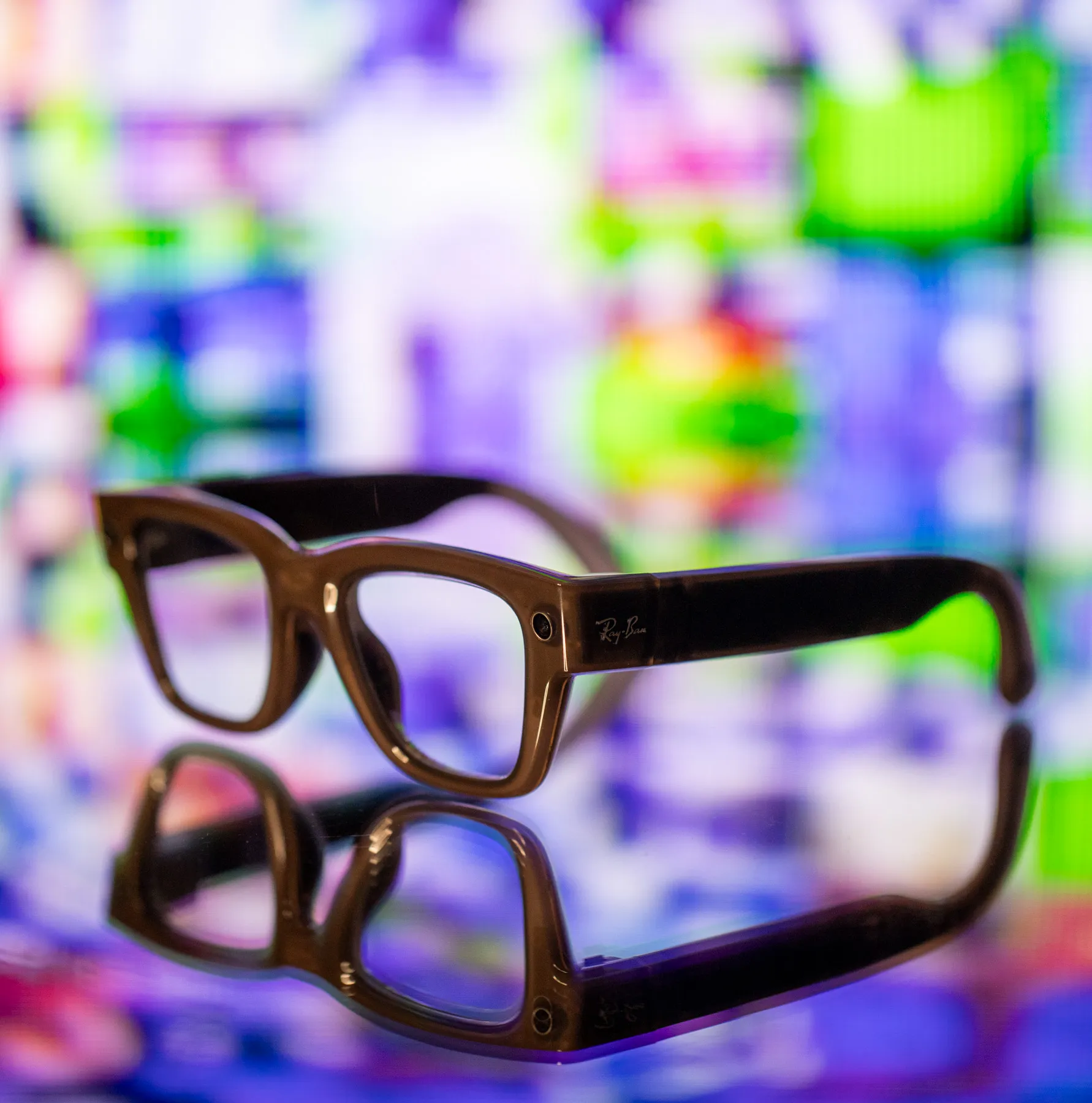 Close up of Meta Ray-Ban Display with a mosaic of TV static behind it.