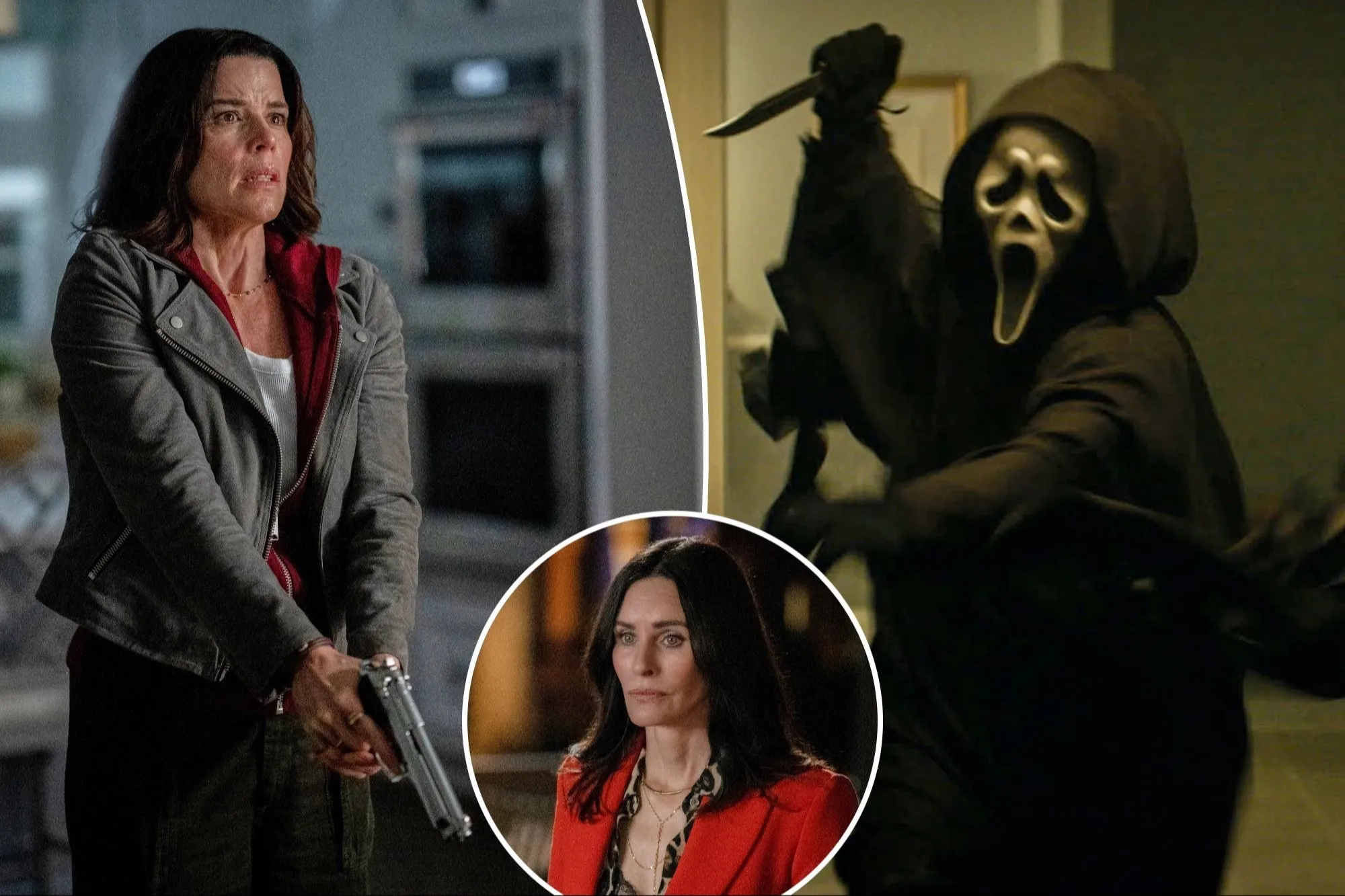 Courteney Cox’s reporter Gale Weathers arrives in Pine Grove with a camera and Chad (Mason Gooding) and Mindy (Jasmin Savoy Brown), brother-and-sister characters from the last two movies who are now her “hot interns.”