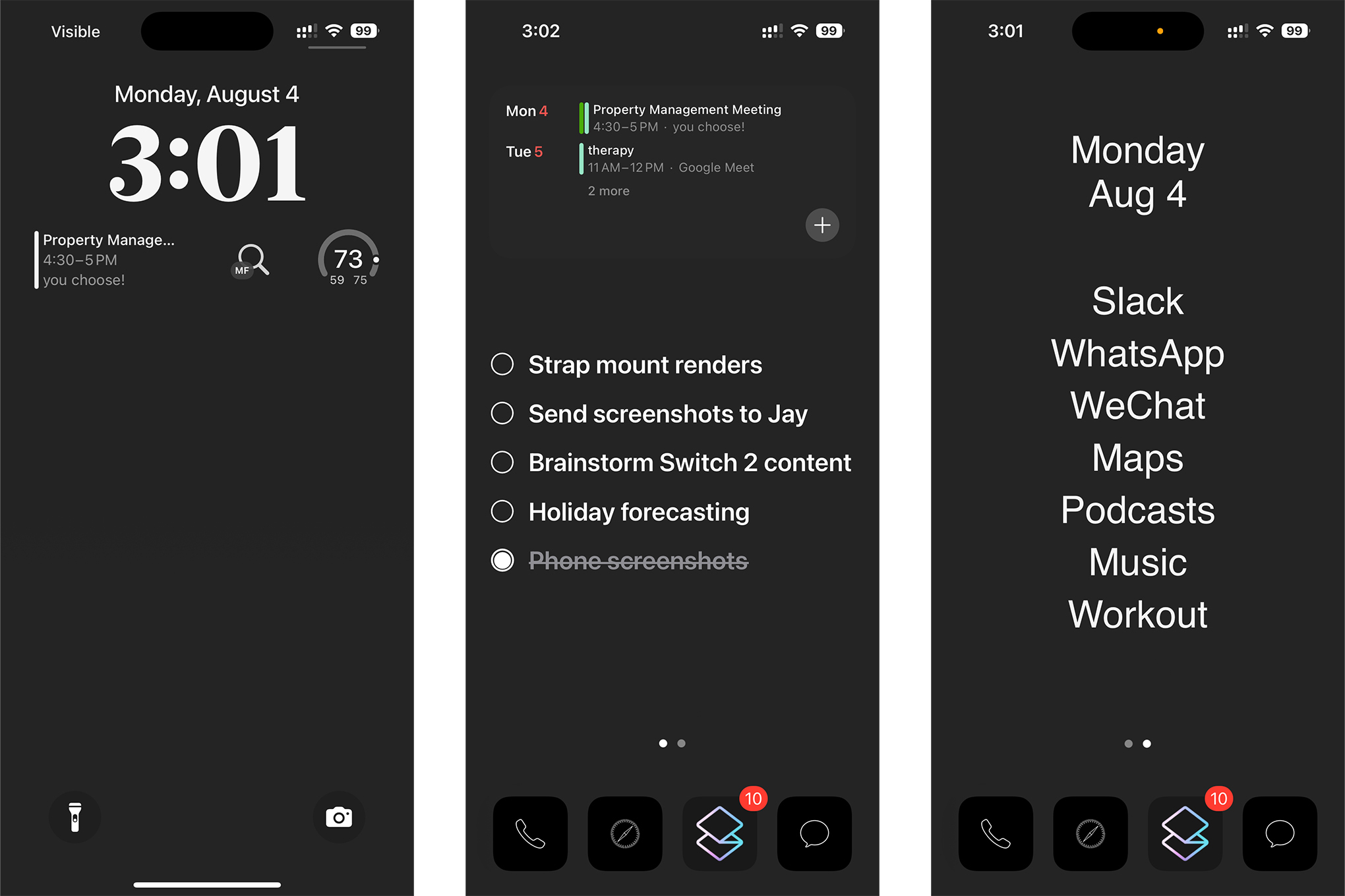 The docked apps: I used a minimal black icon pack mixed with Siri shortcuts, except for the Superhuman email app.