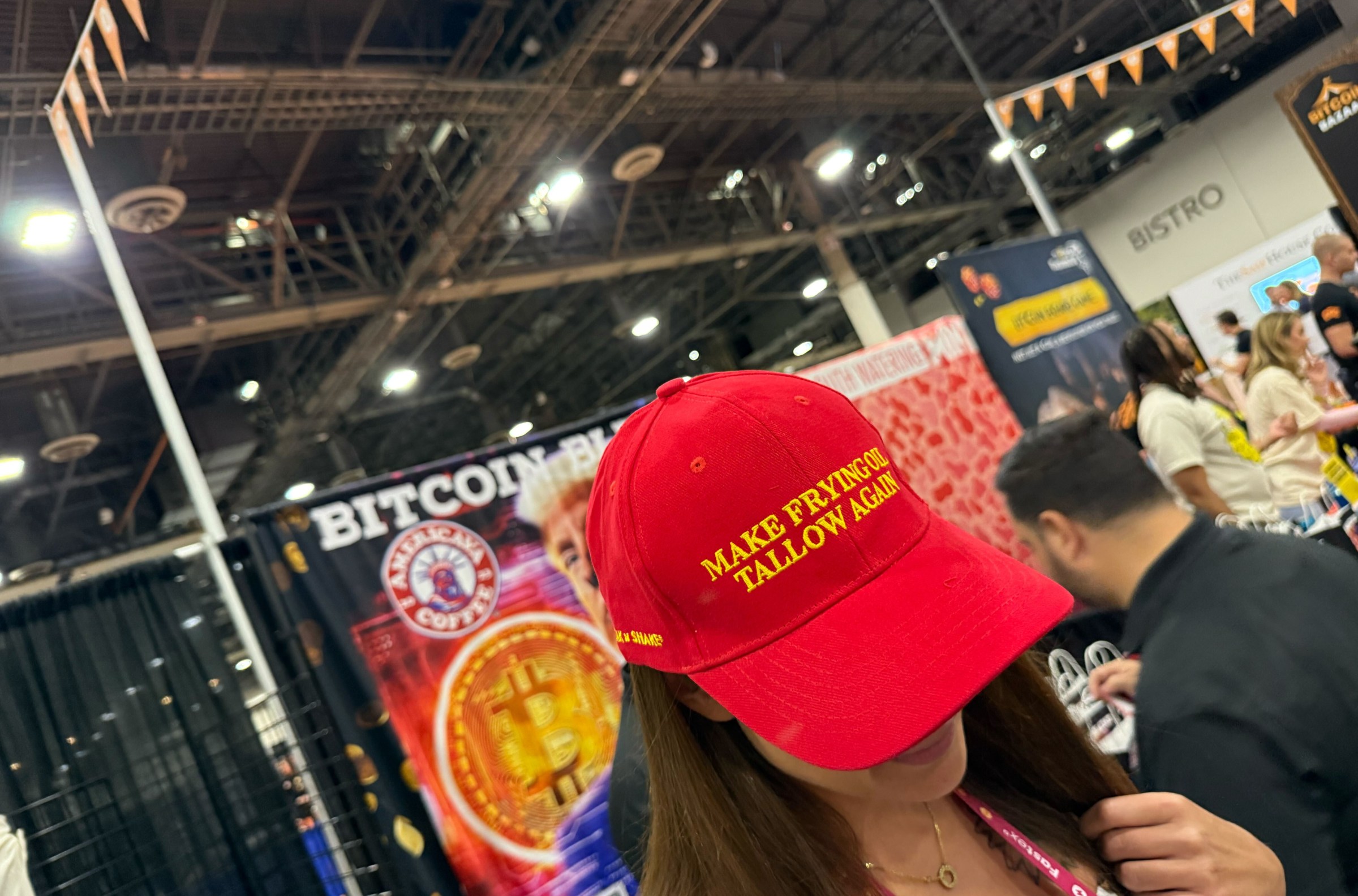 I walked into the main expo center, past a crypto podcaster in a sequined bomber jacket talking to a Wall Street Journal reporter. For some reason, his presence was a relief. Even though he was clearly a Trump supporter — his jacket said TRUMP: THE GOLDEN AGE on the back — there was something more janky and homegrown, less corporate, about him. But the moment I looked up and saw a massive sign that said STEAKTOSHI, the unease returned. A ghoulish-looking group of executives from Steak ‘n Shake, the fast food company with over 450 locations across the globe, had gathered under the sign in a replica of the restaurant. They were selling jars of beef tallow, with a choice of grass-fed or Wagyu, and giving out a MAKE FRYING OIL TALLOW AGAIN hat with every purchase an overt embrace of the right-wing conspiracy that cooking with regular seed oils would lower one’s testosterone. (Relevant to the conference: they were also advertising that their restaurants now accepted Bitcoin.)