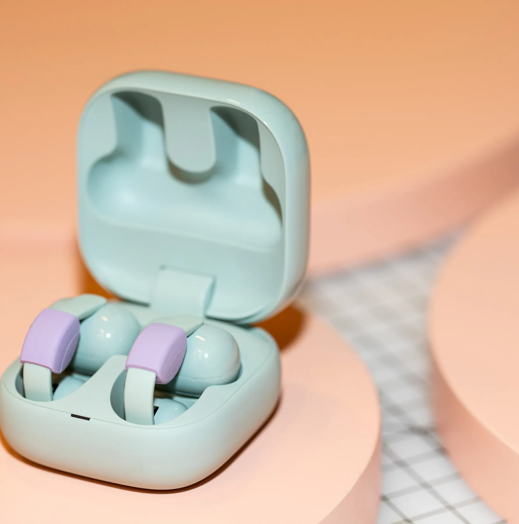 The Sony LinkBuds Clip earbuds with their clear silicone cushions on a peach circular surface above lavender cushions on a graph paper surface.