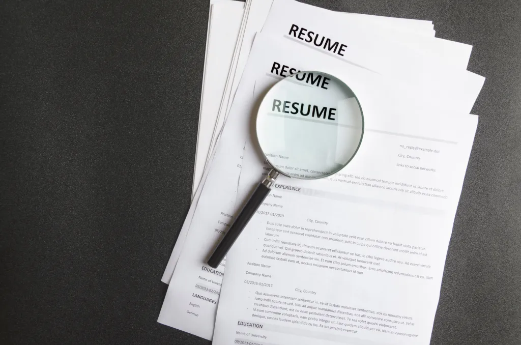 A magnifying glass rests on a stack of resumes on a black surface.
