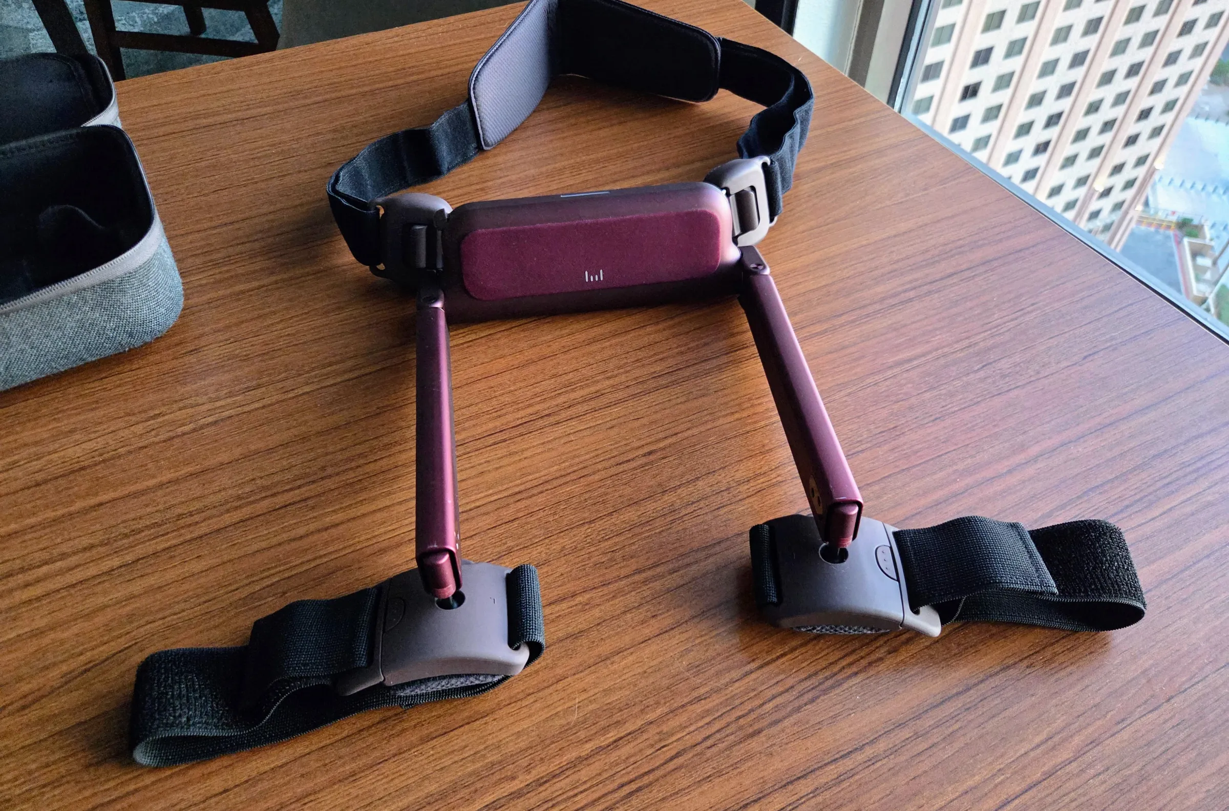 The flat bars also made a decent laptop rest when I sat down to work, nice and level unlike my actual lap, though I’d probably want to cover them with a softer material to avoid metal sliding on metal. I also found the Wim’s joints, including a ball joint at each leg cuff and a telescoping joint that dynamically lengthens each arm as I walk, did a better job of following the natural motion of my legs.