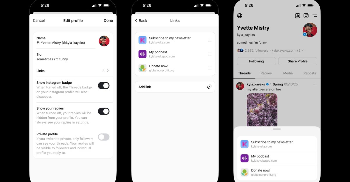 Threads is making it easier for creators to share personal links with their communities and followers. The link-sharing update announced today now allows Threads users to add up to five links to their account bios and provides performance insight that shows how many people have visited links shared in posts and profiles.