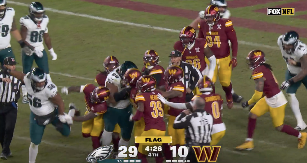 A brawl between Philadelphia Eagles and Washington Commanders players.