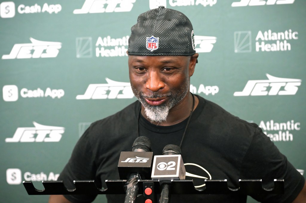 Jets coach Aaron Glenn at a press conference.