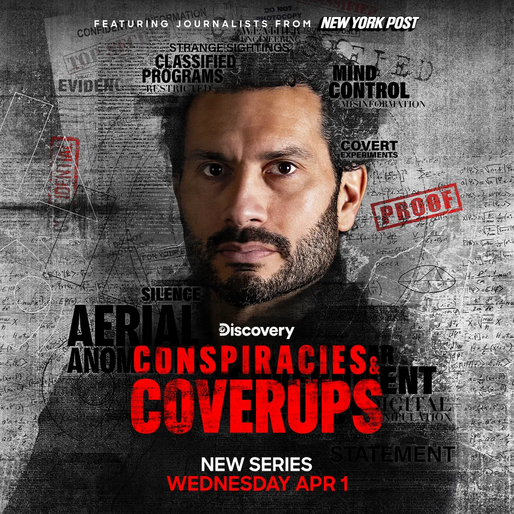 Illustration for the Discovery series "Conspiracies & Coverups" featuring a man's face over a collage of classified documents and text like "Mind Control" and "Covert Experiments".