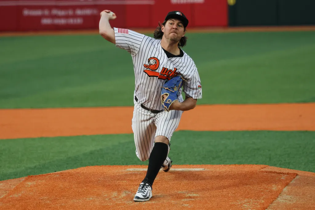 Trevor Bauer throws during the third inning of a game against the Hagerstown Flying Boxcars in Central Islip, N.Y. on Tuesday, April 21, 2026.