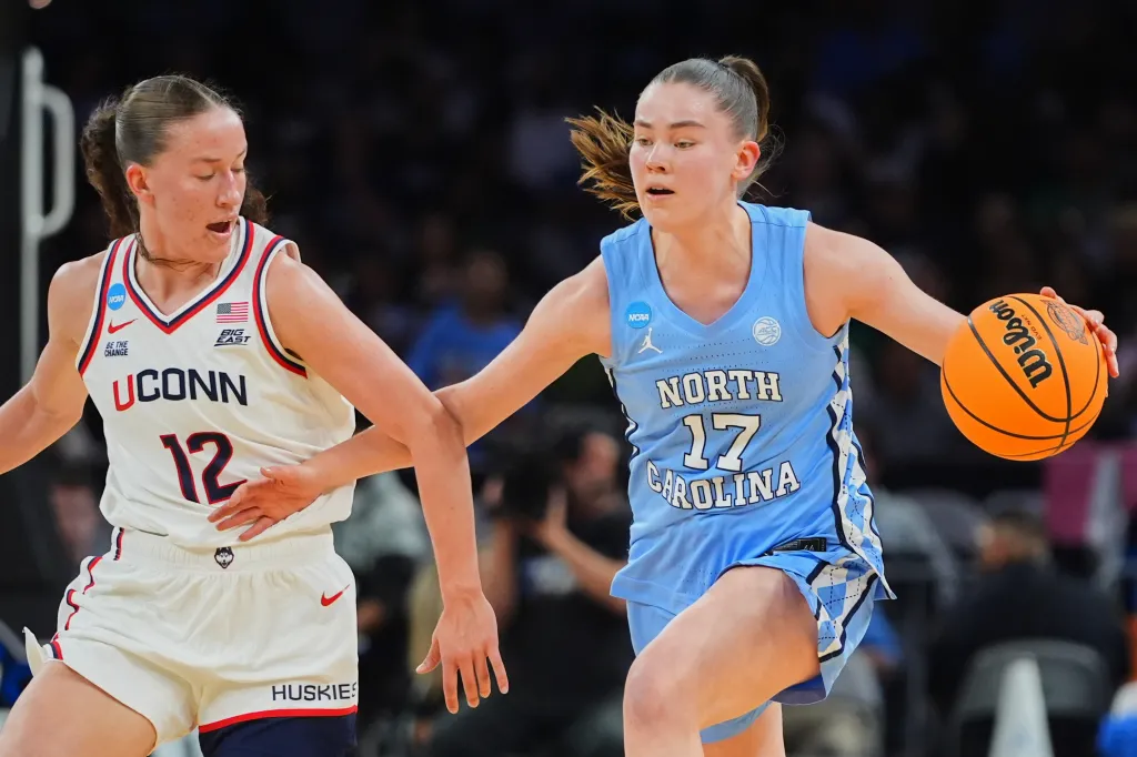 Ashlynn Shade (UConn) and Elina Aarnisalo (North Carolina) playing basketball.