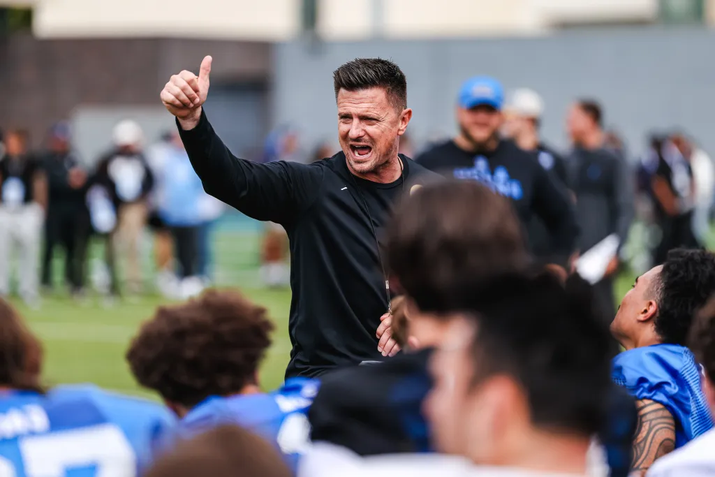 Bob Chesney giving a thumbs up and shouting encouragement during April 2026 spring practice.