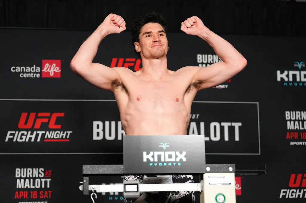 Mike Malott poses on the scale during the UFC Fight Night official weigh-ins on April 17, 2026 in Winnipeg, Manitoba. Zuffa LLC