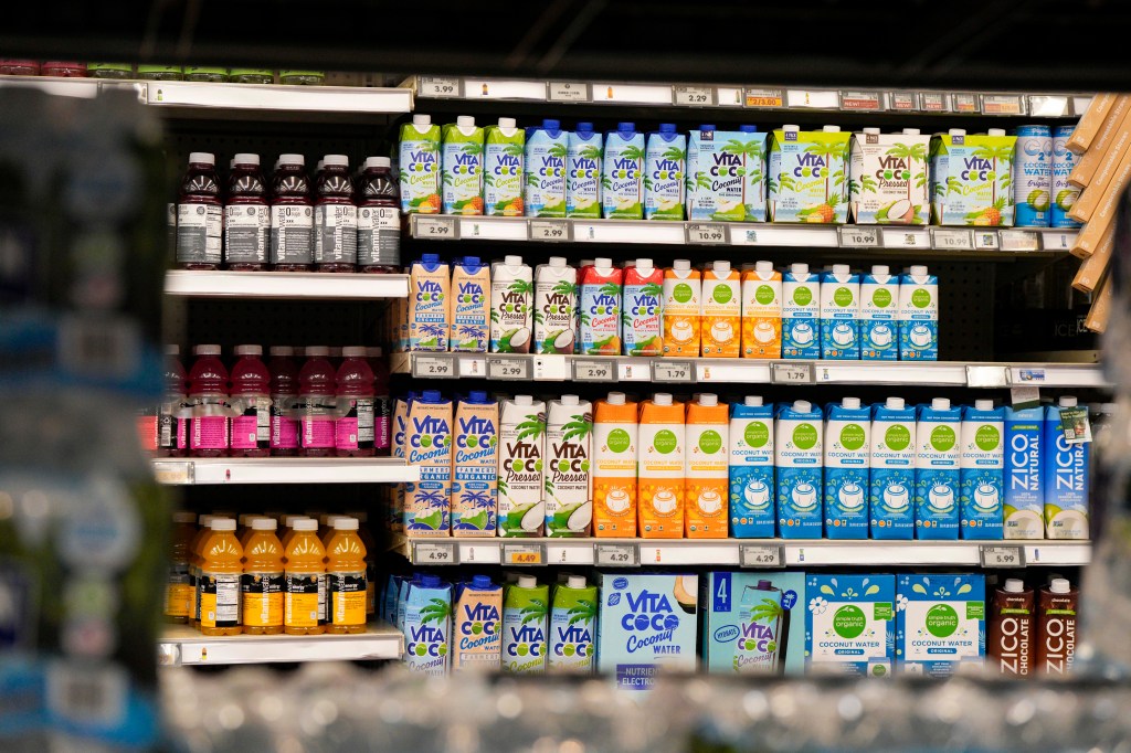 Grocery store shelf stocked with various brands of coconut water and other beverages.