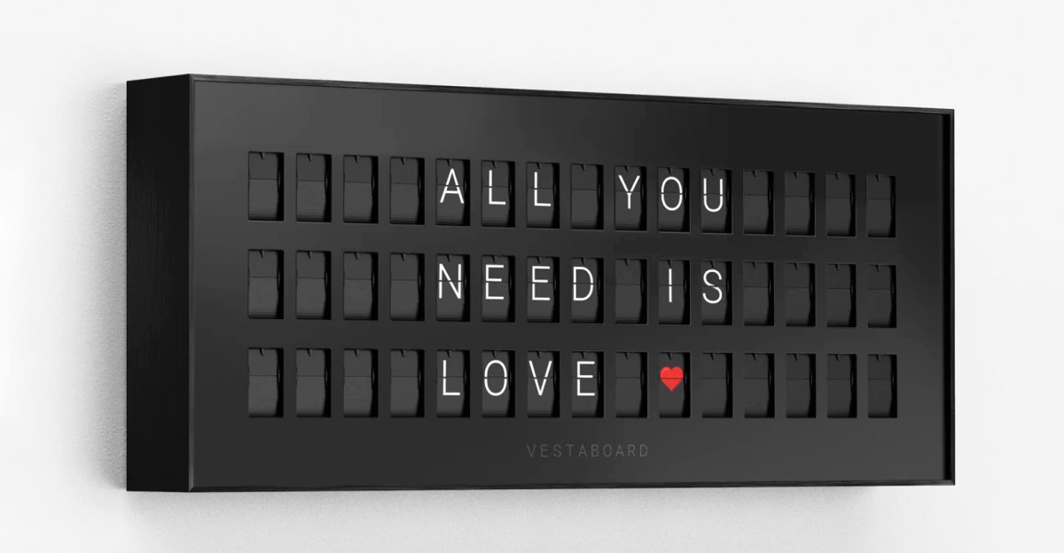 Functionally, the Note is nearly identical to the original Vestaboard. But instead of using 132 split-flap mechanisms, which the company calls Bits, the Note only features 45. Each can display 64 alphanumeric characters plus other symbols like punctuation, solid colors, and a newly added red heart. The display measures 24.5 inches wide, or 28.4 inches with an optional bezel frame that adds $169 to the full retail pricing.