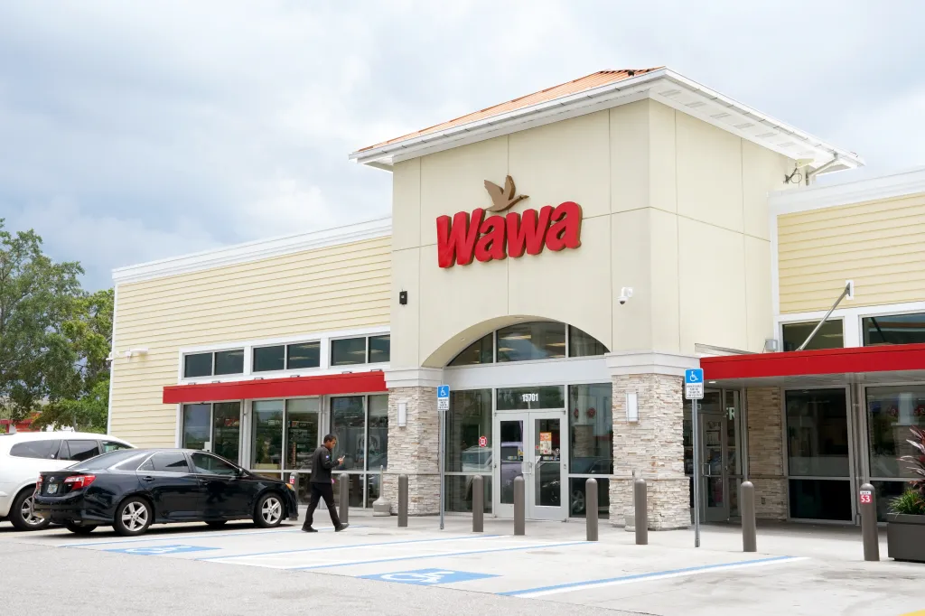 Wawa convenience store exterior with a red and brown logo, a man walking on the sidewalk, and cars parked outside.