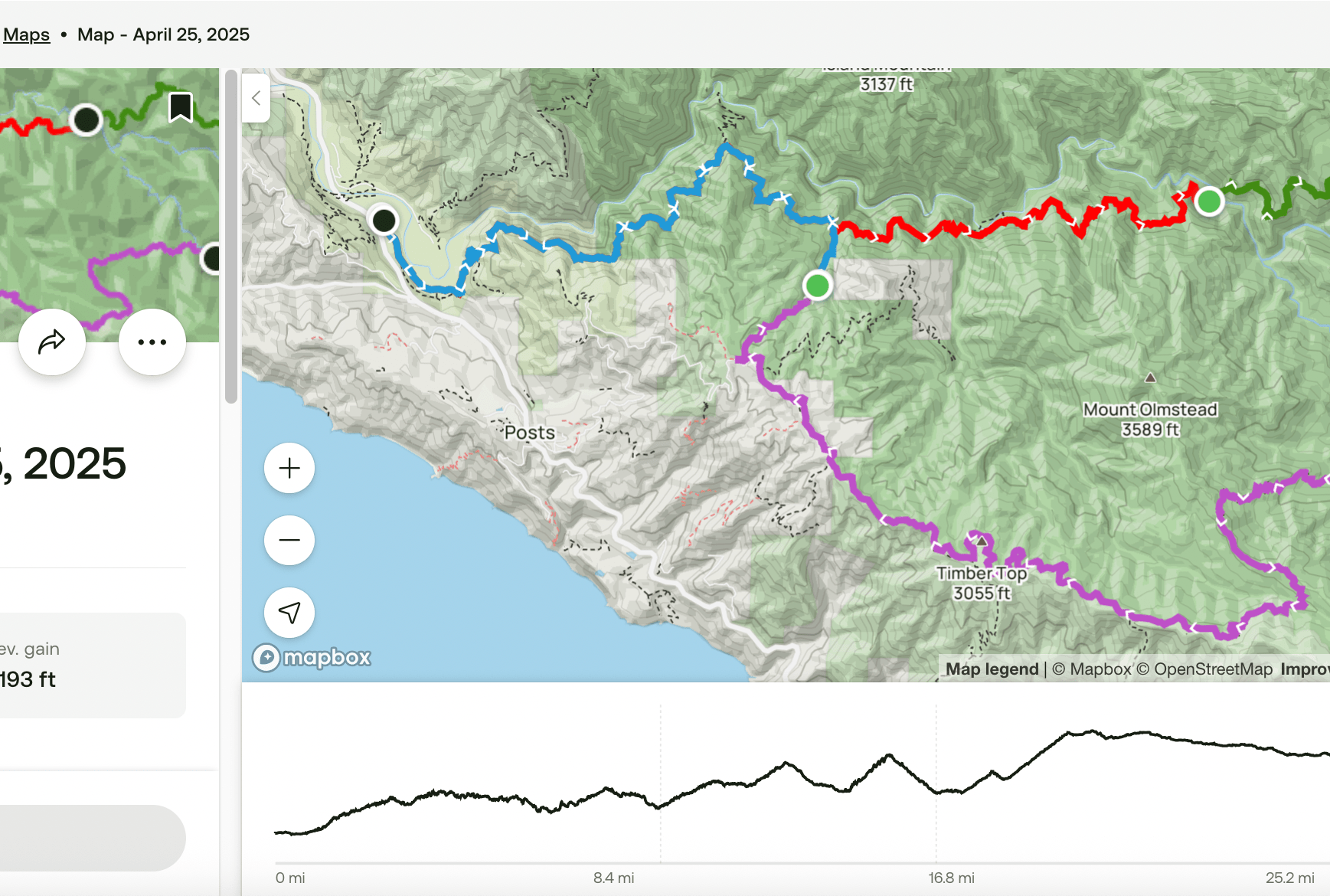 Here’s CalTopo’s route-planning; you can see I’m considering doing the route in three days, rather than four.
