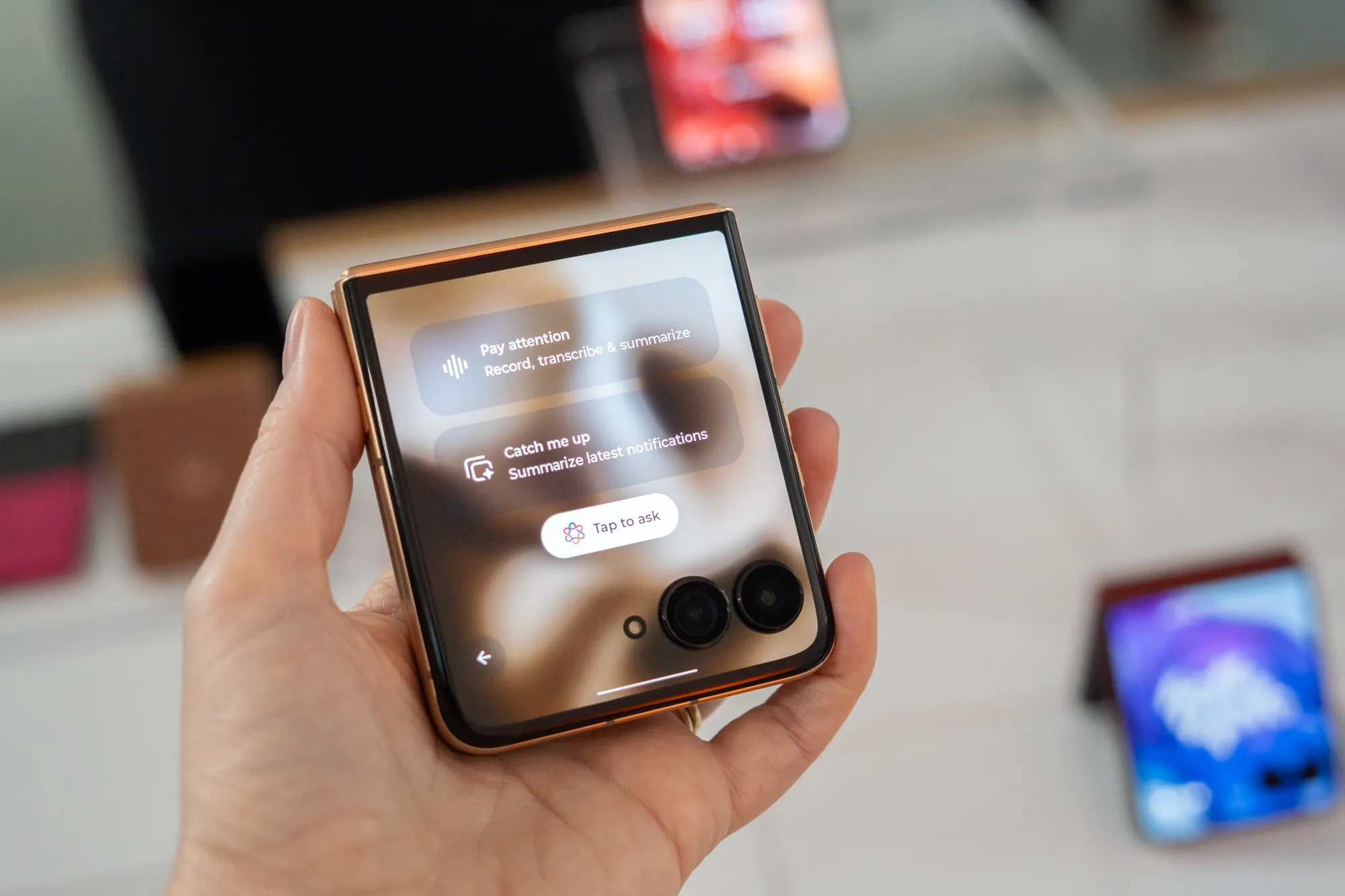 The first phone I tested was the one for which I had the highest hopes: the Motorola Razr Ultra. I remain convinced that flip phones are a good idea, and that the combination of smartwatch-style outer screen with a normal-sized inner screen is a compelling one. The Razr Ultra’s hardware is pretty close to right, at least for my purposes. Flipped open, the phone is a little tall, and can be hard to navigate with one thumb, but that’s true of every big phone now. I didn’t mind the slight crease in the middle, and I love the squareish shape of the phone when it’s closed. I found myself treating the closed phone like a tiny Gemini-specific walkie-talkie — bring the phone up to my mouth, hold the side button, and ask inane questions about cherry blossoms.