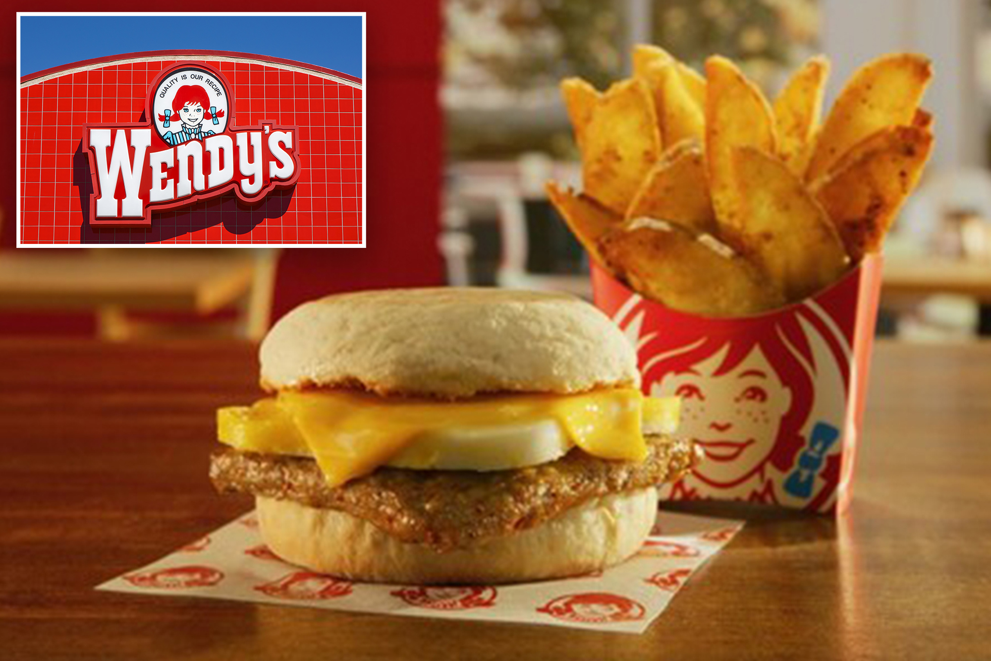 The Wendy’s breakfast deal includes a choice between a bacon, egg and cheese English muffin or a sausage, egg and cheese English muffin, along with a side of small seasoned potatoes.